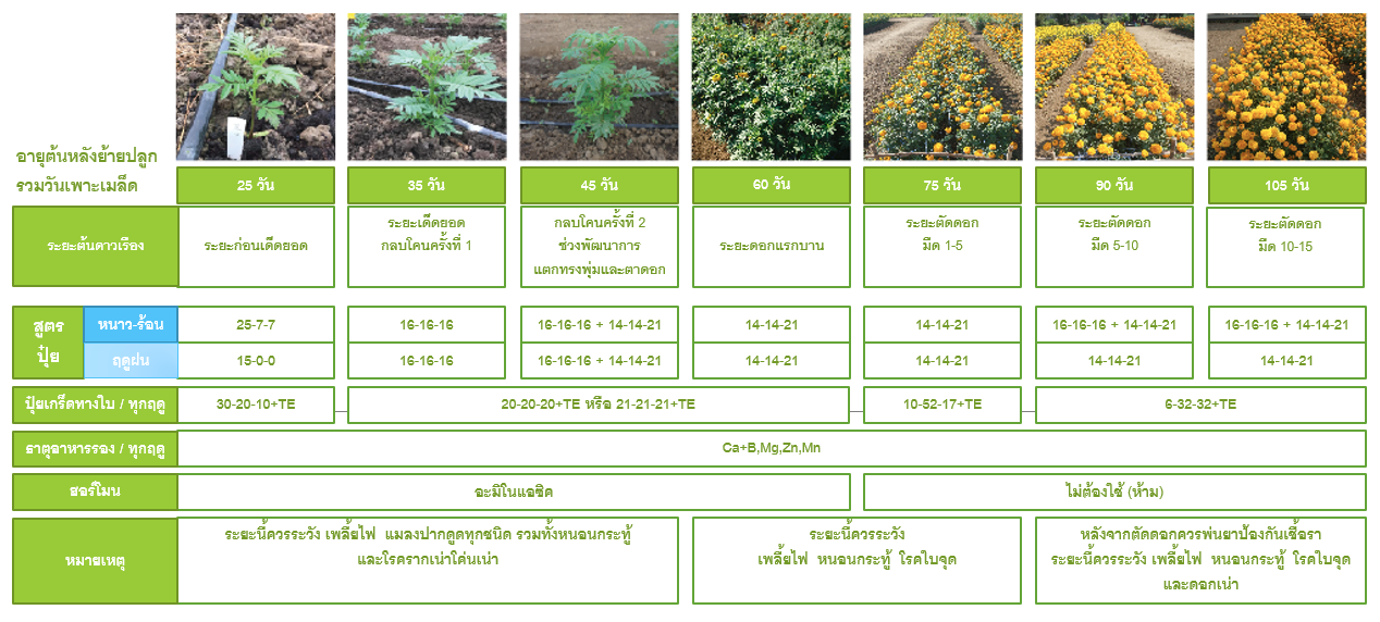 การปรับสภาพดิน เพื่อให้ดินมีค่า pH เป็นกลางทำให้ดาวเรืองนำธาตุอาหารในดินไปใช้ได้โดยใส่ โดโลไมท์ 300-400 กก./ไร่