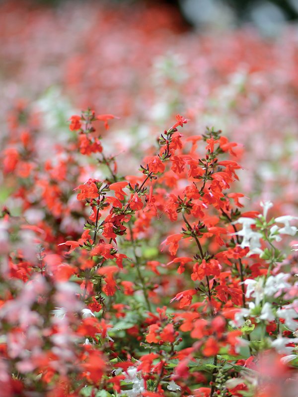 ซัลเวียค็อกนีเซีย ที่ออกดอกเป็นช่อยาว ตลอดก้านดอก มองดูคล้ายนกฮัมมิ่งเบิร์ด ชอบสภาพอากาศเย็น นิยมปลูกเป็นไม้ประดับแปลง